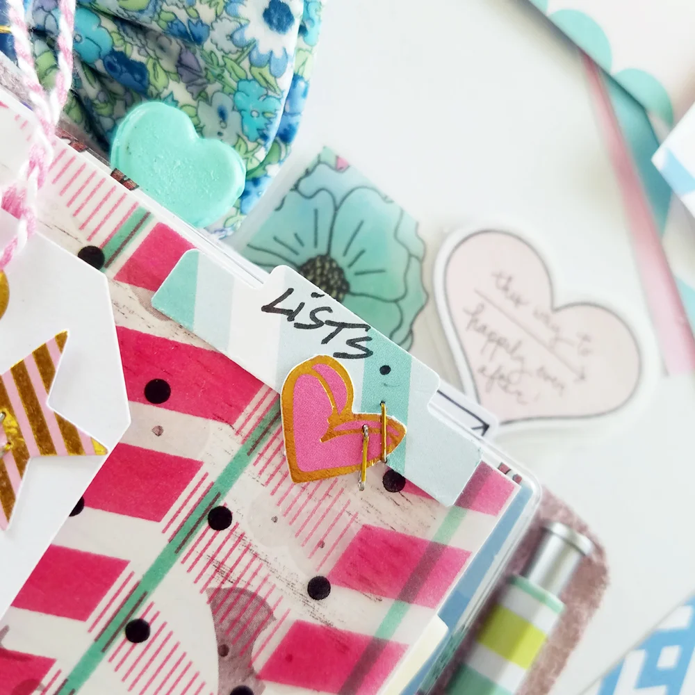 Now then, let's get the ball rolling on this pocket sized planner!!! I started out by making an insert cover using this dotted pattern paper. Fussy cutting this Bambi was a no brainer. I love that he's not brown but teal!! I added some tabs and a die cut to round out this first little dashboard.
