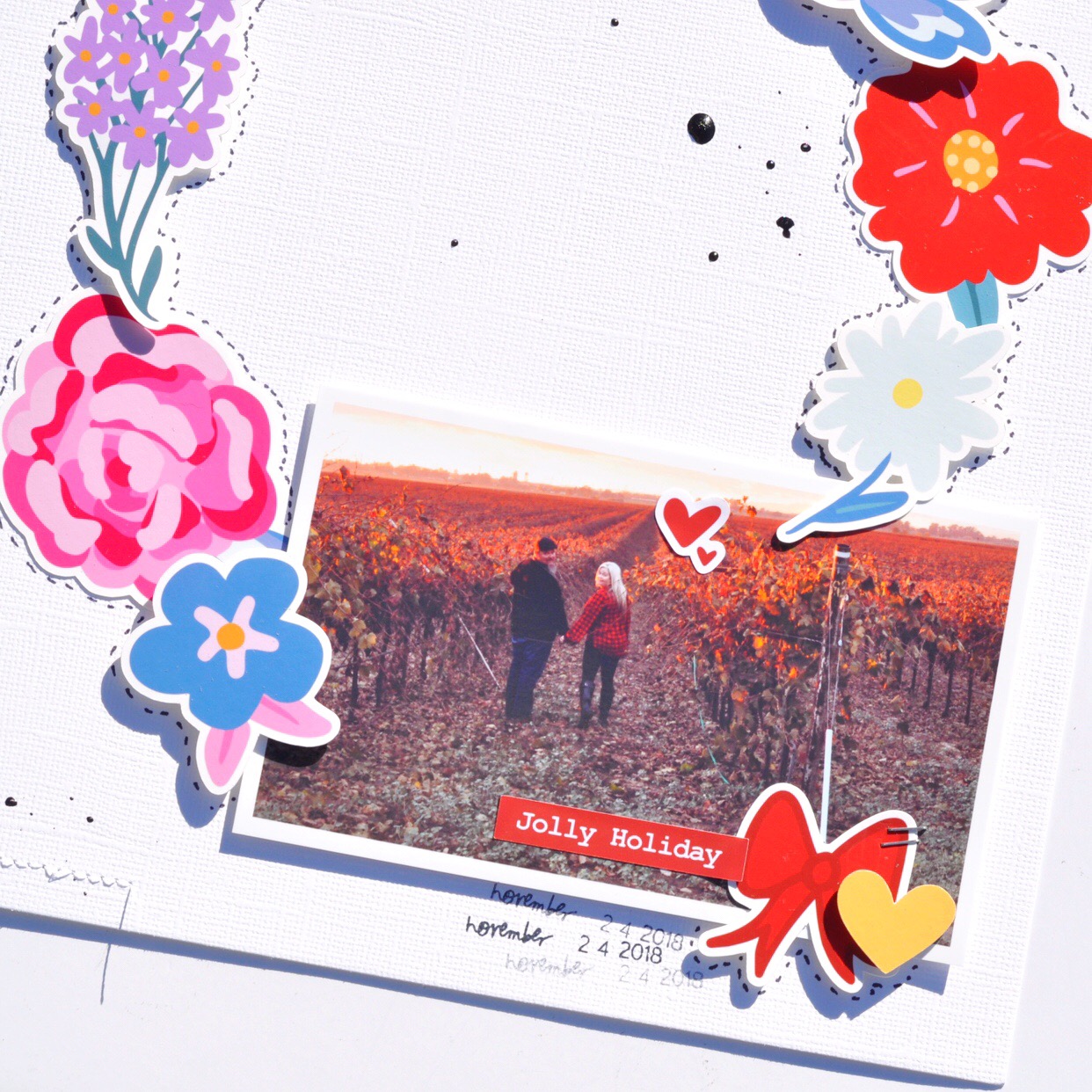 I then decided that the layout needed more “POP” so I decided to “faux” stitch with a black marker around the inside and outside of the wreath.