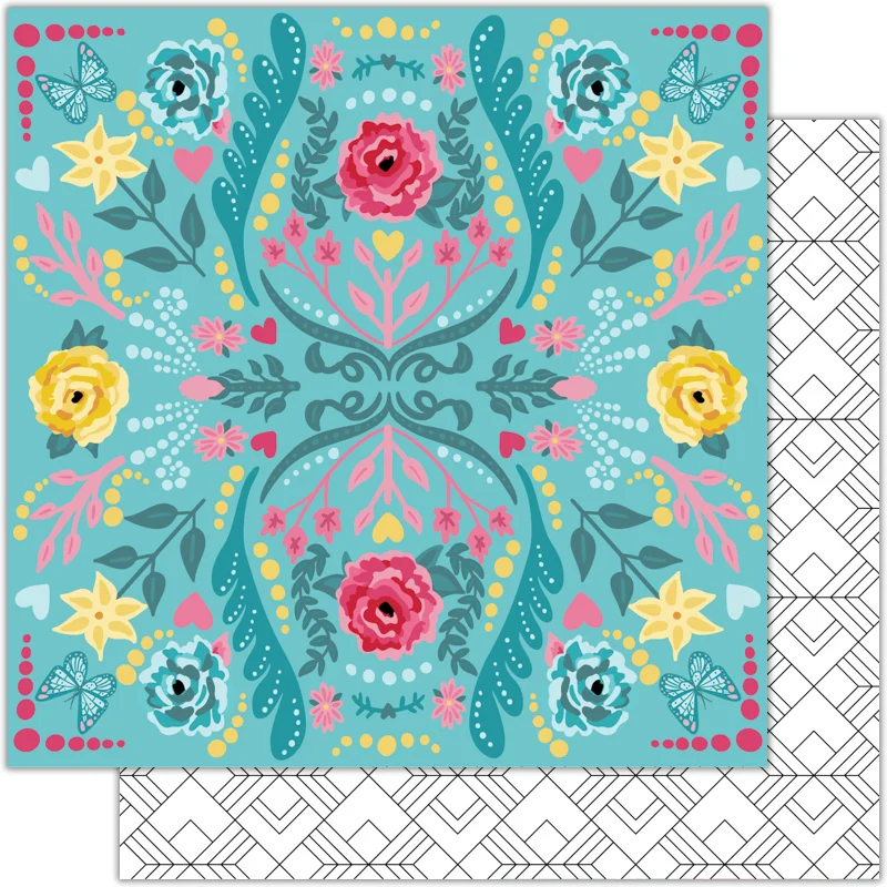 This next patterned paper is titled "Her name was Aurora" and it is one of my absolute favorites! It is a gorgeous floral with a light pink background and lots of beautiful and vibrant roses! The roses come in pink, blue and yellow and in various shapes and sizes. On the other side of the patterned paper is a simple but versatile yellow and white diamond pattern.