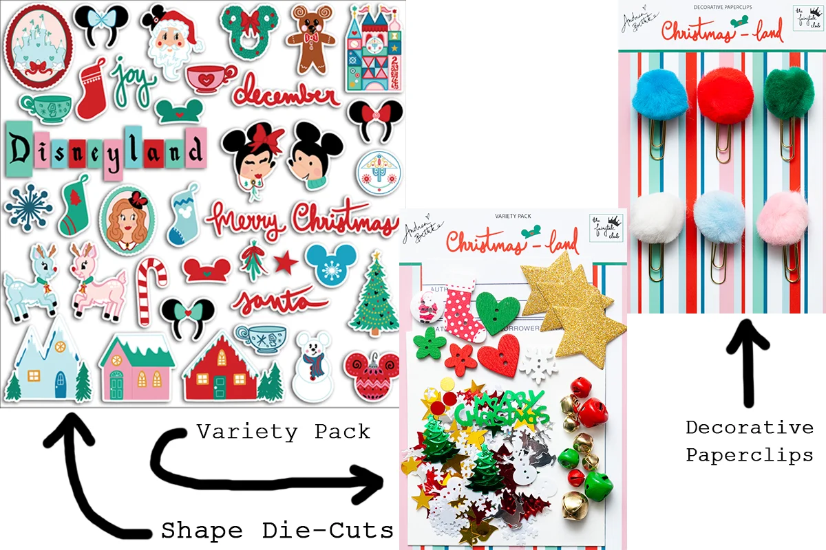 First, let’s talk about what the kit was inspired by and what it is all about. Whenever we have a special event, we do a special kit that is specifically made and themed for the event and the projects that goes with that event/class. In the past we have held our events at Disneyland, and, focusing on a particular Disney theme, they are always filled with Disney magic! For example, the theme for our most recent event was “The Wonderful World of Disney,” which was about vintage Disney and the opening of Disneyland in 1955. While this event isn’t happening at Disneyland, it is all about Disney at Christmas-time, and is therefore chock-full of that Disney magic! You’ll find loads of Christmas imagery but with a Disney spin, like our Mickey ears-wearing Santa, the Mickey ears wreath, our gingerbread mouse, and our festive Small World facade, just to name a few! For more examples, just below you can see a quick overview of the awesome embellishments in the kit (we’ll take a closer look later on)!