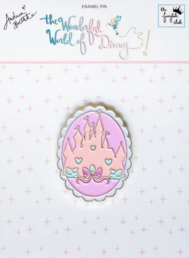 Yes, that is right, we made a pin! And it is so very super duper adorable and girly and vintage-kitschy-cute! It is in pretty pinks and lavenders and blues and looks super “Kuwaii” if you ask me! It is a fun pink cameo of the Sleeping Beauty Disneyland castle and it has the sweet little Disney birds with a big pretty bow on it! I just absolutely love it! It is perfect to use to wear and also perfect to put on your planner/scrapbook album as another embellishment!!! It is just perfect! I am super excited about this pin and I hope that it is just the first of many pins from The Fairytale Club to come!