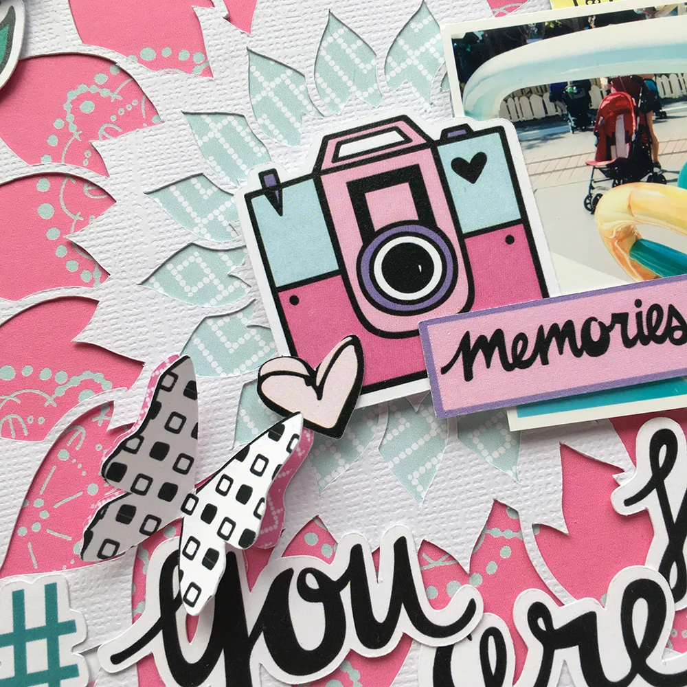 I cut a small strip of paper to add to the bottom. This print really made me think of the event this photo was taken at (Throwback Night at Disneyland) and so I wanted to integrate it into this layout. Then it was time to go crazy with the die cuts! You know me, I'm usually pretty minimalist but this spread was not the time for that! I created a good base of die cuts and then added foam to pop a bunch of pieces up. After that, I added a few sequins to add a touch of glitter to the mix. #maximalist, am I right?